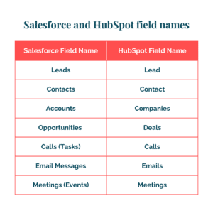 For a successful field mapping process, match the field names used on Salesforce to those on HubSpot, and build custom properties in HubSpot to ensure data consistency. Check out the following table for reference:
